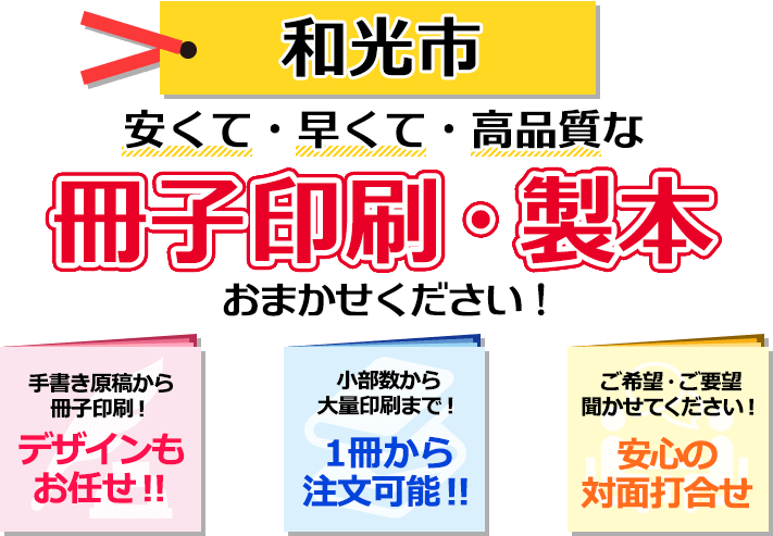 製本印刷.comは、埼玉県和光市(丸山台・本町・ 新倉など)でパンフレットなどの冊子印刷・製本を専門にお手伝いさせていただいている印刷会社です。冊子製本の依頼が可能な、和光市の製本会社をお探しの方は、少量印刷から大量印刷までご遠慮なくお問い合わせ下さい。製本会社専任スタッフがお伺いしての対面打ち合わせから発送まで、お客様の冊子作成をサポートいたします。